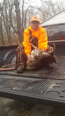 Hi my name is James Hay I am 38 years old this is my biggest buck I ever got it is an 11 point with an 18 inch spread I got it in Milford Township arount 9:00 am it was chilly and windy in the woods. |